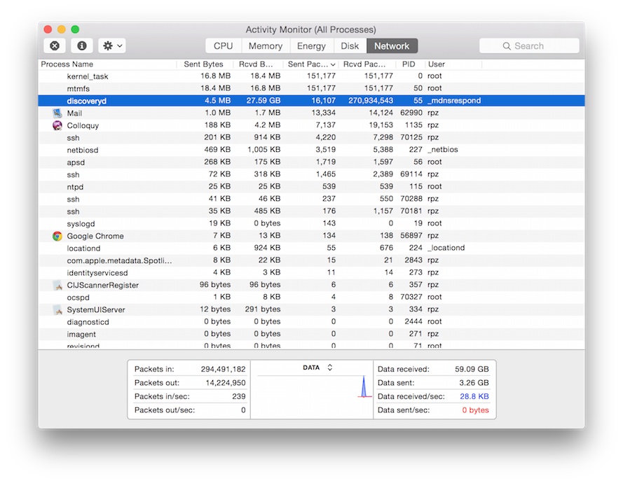 Not sure what to do next, I open the OSX Activity Monitor. In desperation I click on the Network tab.