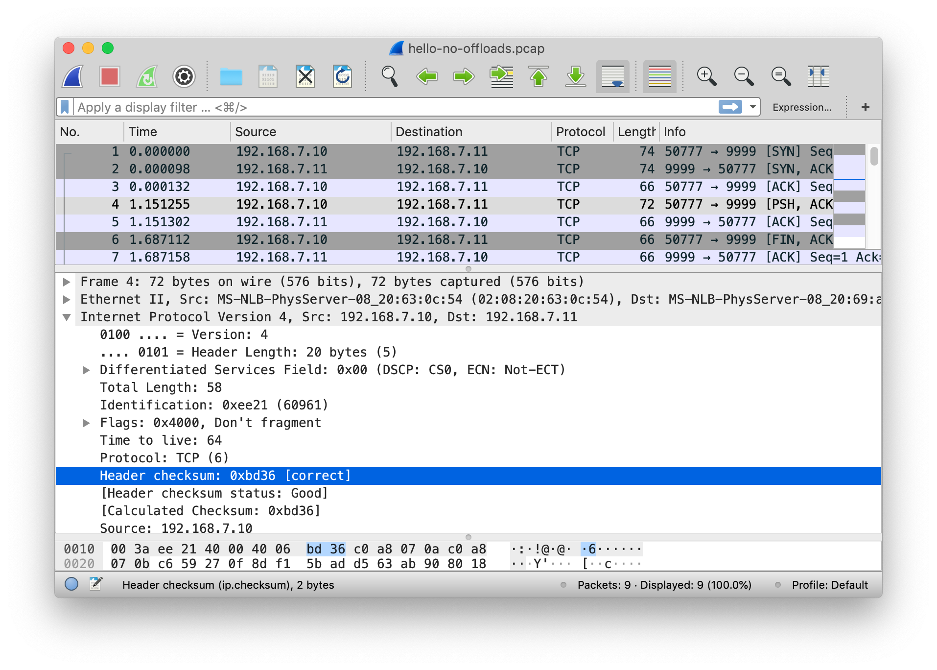 dladm create-bridge) to switch packets between networking devices. This is a bit confusing because in the physical world you would use a cable to link the port of the NIC to the port of the switch. But in the simnet world the port of one simnet is connected directly to the port of another — so it would seem impossible to ever create L2 segments. However, the bridge is implemented in software and doesn’t need to emulate the physical world exactly. Instead, the bridge code inserts itself at a very low level of the mac module in order to know when an Ethernet frame should be forwarded from one device to another. - Wireshark checksum verification