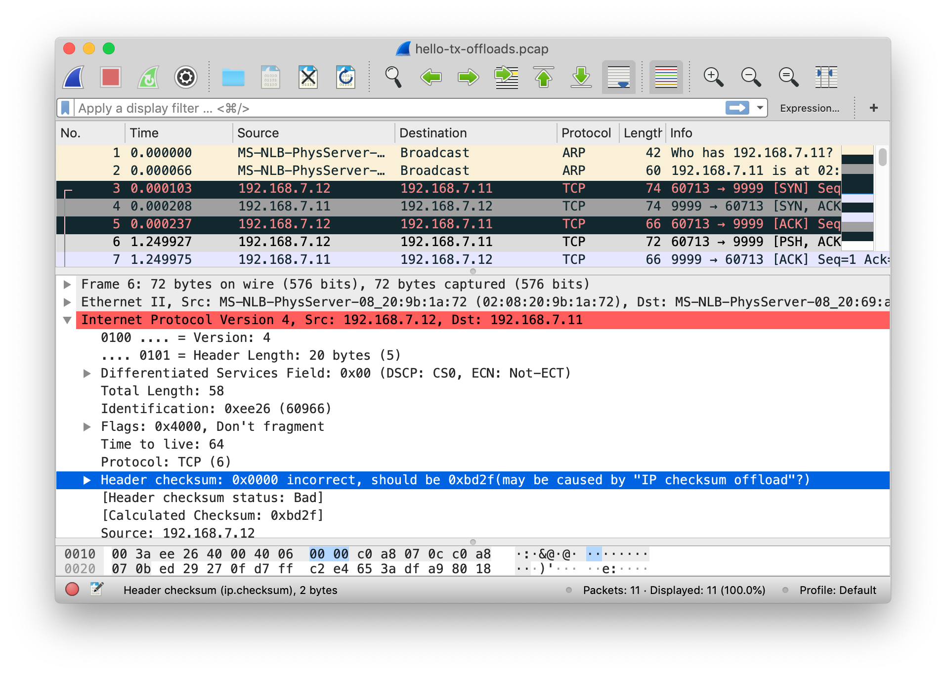 Let’s test the TCP/IP Tx checksum offloads by setting the properties and using Wireshark to verify the checksum value is zero.